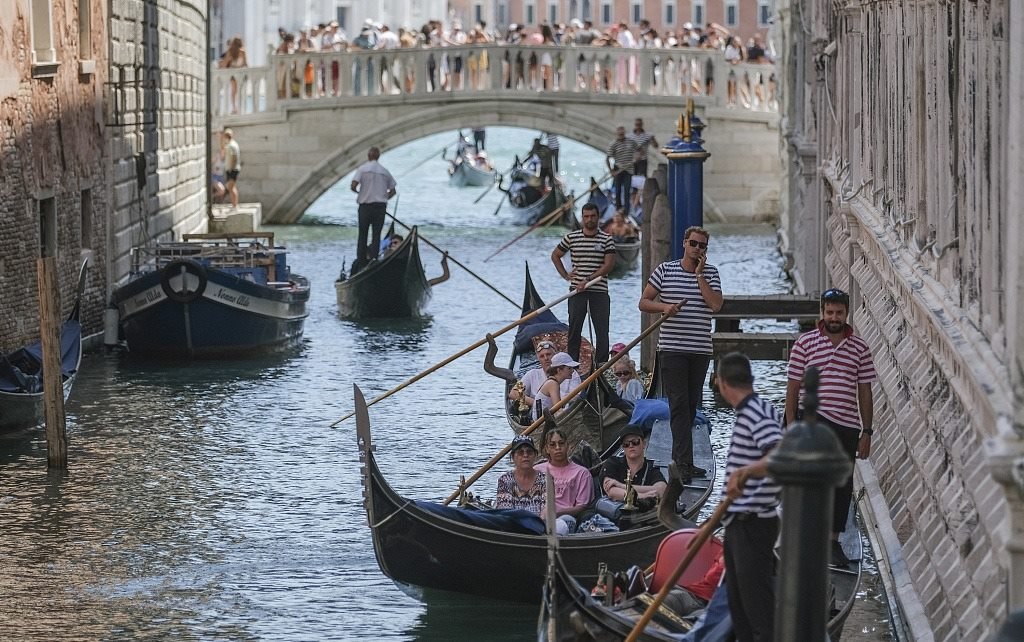 當?shù)貢r間2023年8月2日,意大利威尼斯,交通擁擠,船夫們在索斯皮里橋附近緩慢前行。