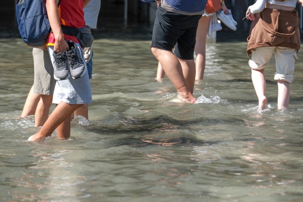 當?shù)貢r間2023年8月6日,意大利威尼斯,城內部分地區(qū)積水嚴重,游客光腳走在水中。