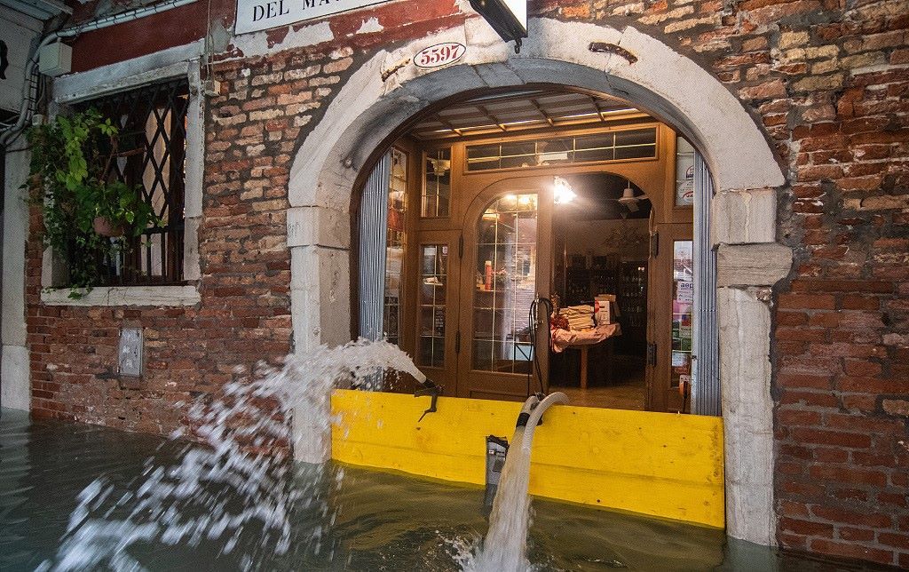 當?shù)貢r間2019年11月17日,意大利威尼斯,當?shù)厮汲掷m(xù)。一家餐廳用水泵排水。