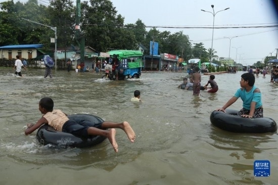 8月12日,孩子們在緬甸勃固鎮(zhèn)積水處玩耍。新華社發(fā)(苗覺梭攝)