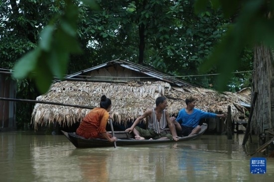 8月12日,在緬甸勃固鎮(zhèn)洪災區(qū),人們乘船出行。新華社發(fā)(苗覺梭攝)