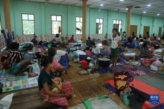 8月12日,人們在緬甸勃固省一處洪災安置點休息。新華社發(fā)(苗覺梭攝)