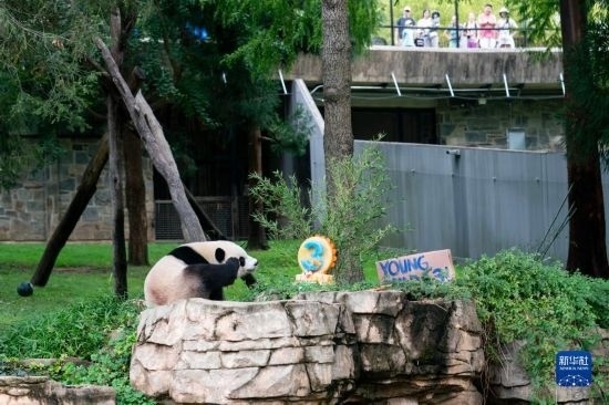 8月21日,游客在美國首都華盛頓史密森學(xué)會國家動物園觀看大熊貓幼崽“小奇跡”過生日。新華社記者 劉杰 攝