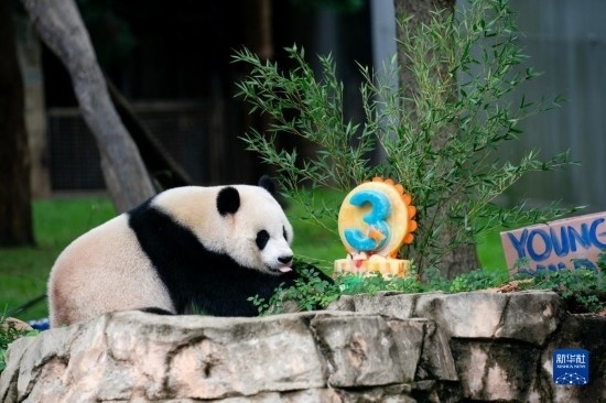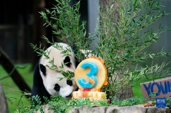 8月21日,大熊貓幼崽“小奇跡”在美國首都華盛頓史密森學(xué)會國家動物園享用生日蛋糕。新華社記者 劉杰 攝
