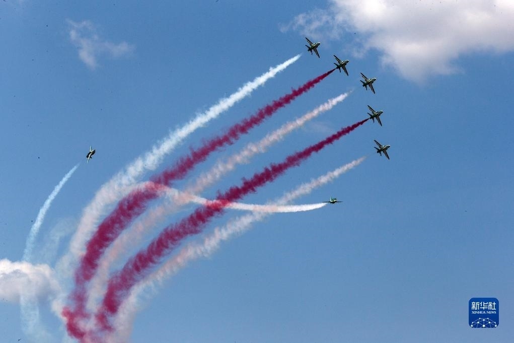 9月2日,在希臘塔納格拉空軍基地的雅典飛行周上,來自沙特阿拉伯的飛行表演隊(duì)進(jìn)行表演。新華社發(fā)(馬里奧斯·羅洛斯攝)