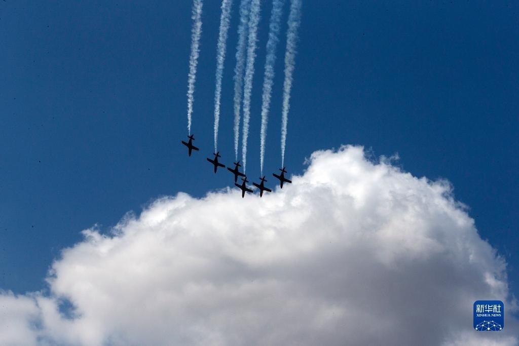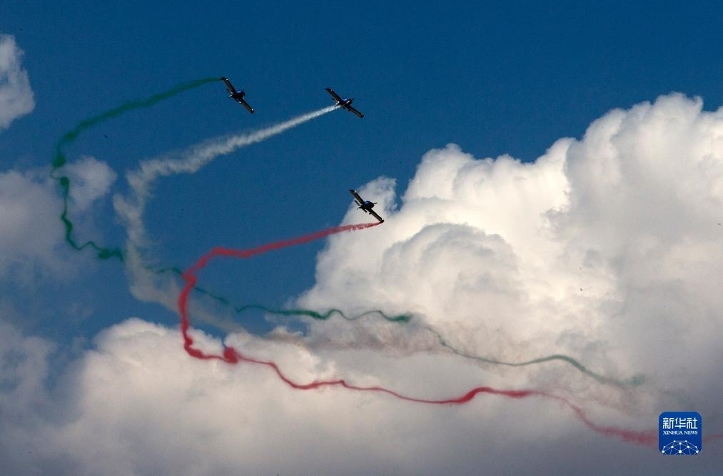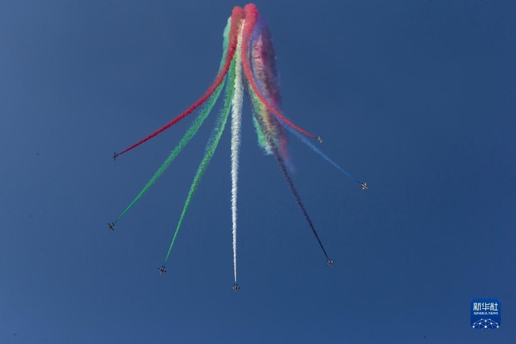9月2日,在希臘塔納格拉空軍基地的雅典飛行周上,來自阿聯(lián)酋的飛行表演隊(duì)進(jìn)行表演。新華社發(fā)(馬里奧斯·羅洛斯攝)