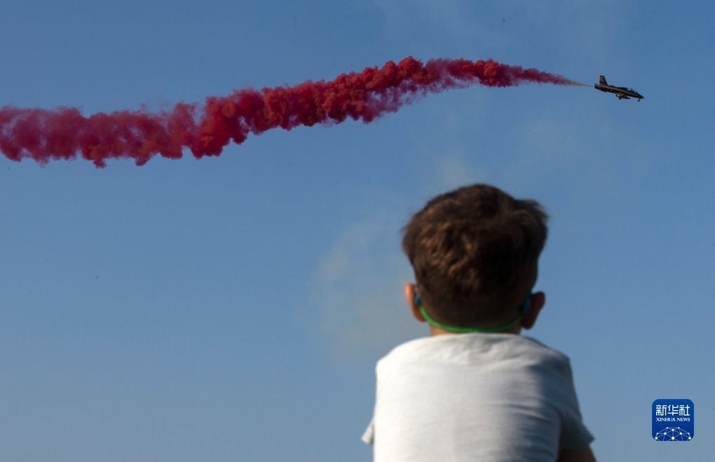 9月2日,一名男孩在希臘塔納格拉空軍基地舉行的雅典飛行周上觀看阿聯(lián)酋飛行表演隊(duì)的表演。新華社發(fā)(馬里奧斯·羅洛斯攝)