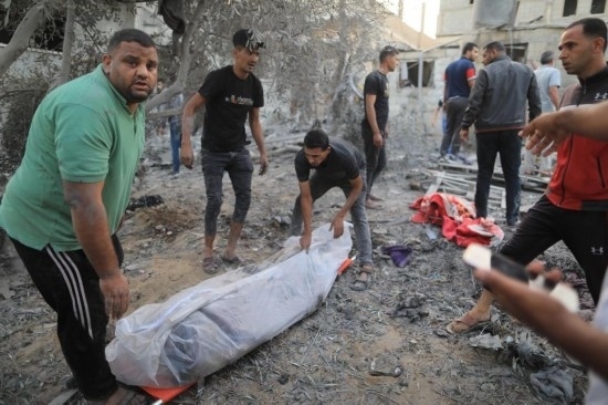 10月12日,在加沙地帶南部城市汗尤尼斯,人們在遭以色列空襲后的建筑廢墟中抬出遇難者遺體。新華社發(fā)(亞西爾·庫迪攝)