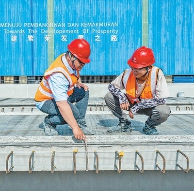 馬來西亞吉蘭丹州的馬東鐵項(xiàng)目一分部制梁場,技術(shù)人員討論生產(chǎn)情況。新華社記者 朱 煒攝
