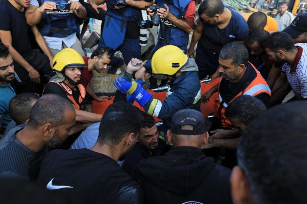 10月16日,在加沙地帶南部城市汗尤尼斯,人們?cè)谠庖陨幸u擊后的建筑廢墟中救援傷者。新華社發(fā)(亞西爾·庫迪攝)