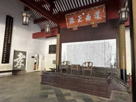 在岳麓書院中央的講堂,陳列著《岳麓書院記》的屏風(fēng)。(本報(bào)記者 劉書文攝)