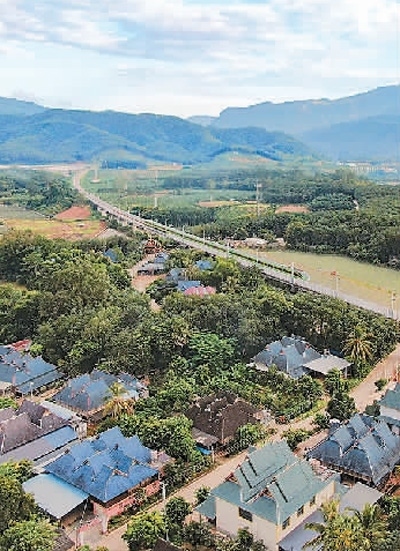 云南省景洪市勐罕鎮(zhèn),中老鐵路上的動車從傣族村寨旁駛過。新華社發(fā)