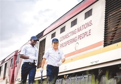 在肯尼亞內羅畢,非洲之星鐵路運營公司機輛部的火車駕駛員(右)與學員從蒙內鐵路機車旁走過。新華社記者 王冠森攝