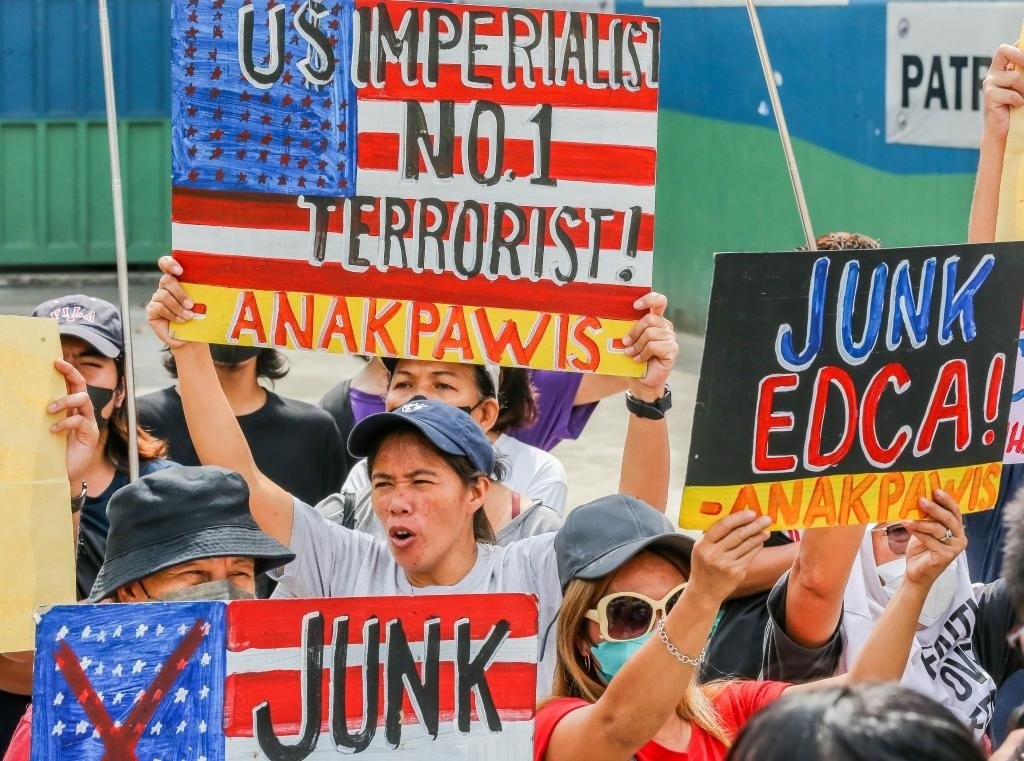2023年4月11日,在菲律賓首都大馬尼拉地區(qū)奎松城,民眾參加集會(huì)活動(dòng),抗議菲律賓和美國軍方舉行聯(lián)合軍事演習(xí)。菲律賓和美國軍方當(dāng)天在菲首都馬尼拉啟動(dòng)為期18天的2023年度“肩并肩”聯(lián)合軍事演習(xí)。新華社發(fā)(烏馬利攝)