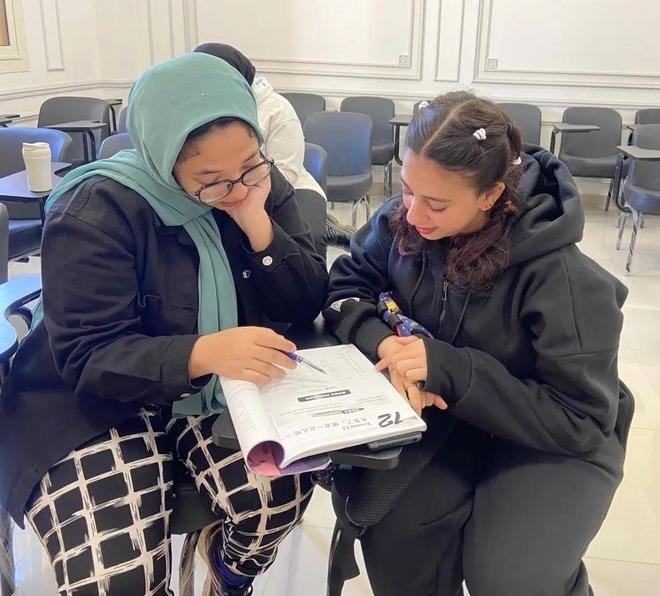 阿巴斯的侄女(左)正在學習。黃培昭攝
