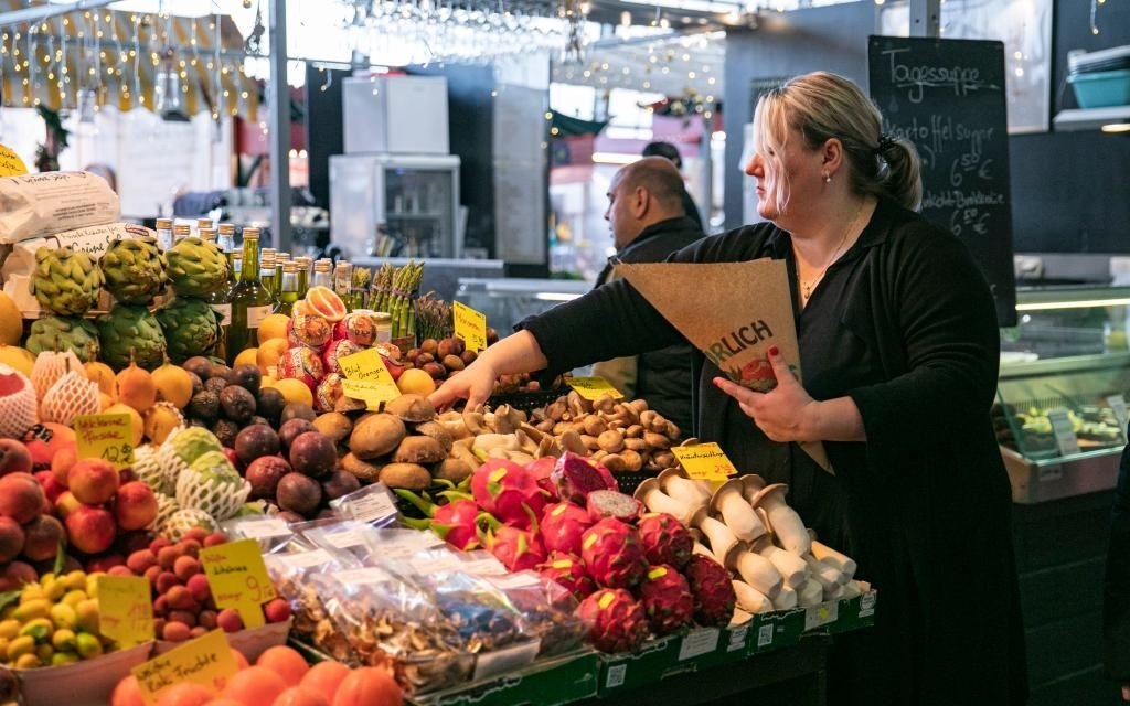 12月20日,在德國法蘭克福“小市場(chǎng)大廳”,一名攤主為顧客挑選水果。新華社記者張帆攝