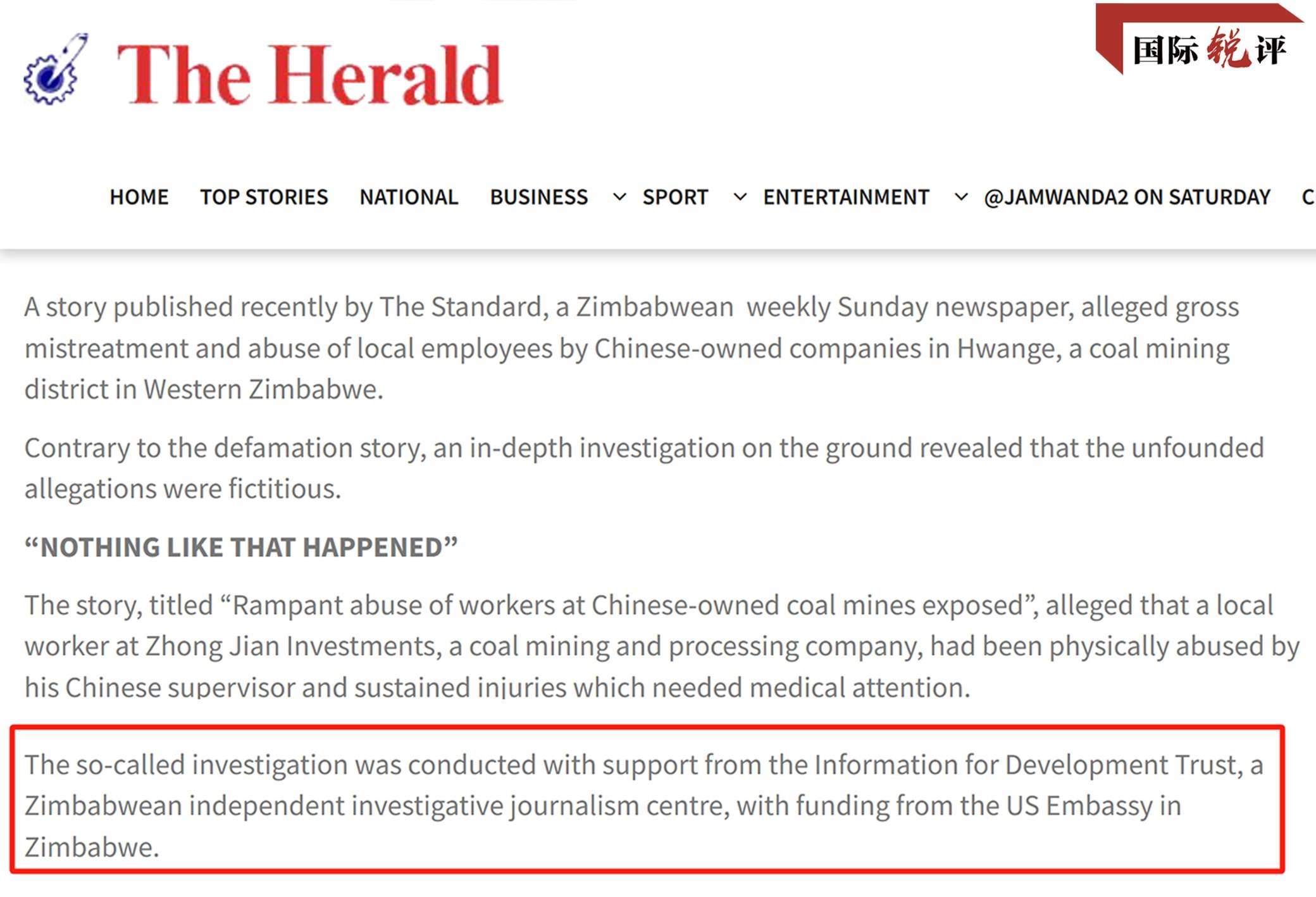 2022年5月,津巴布韋媒體《標(biāo)準(zhǔn)報(bào)》發(fā)布了一篇報(bào)道,污蔑中國(guó)礦企虐待當(dāng)?shù)貑T工,稱這名員工“受傷送醫(yī),還被解雇了”。這家媒體稱,報(bào)道是和津巴布韋一個(gè)名叫“信息促進(jìn)發(fā)展信托基金(IDT)”的機(jī)構(gòu)合作完成的。然而很快,津巴布韋《先驅(qū)報(bào)》就發(fā)文,用大量事實(shí)證明,這名員工只是和中方員工發(fā)生了小口角,并沒(méi)有被毆打,也沒(méi)有被解雇。
