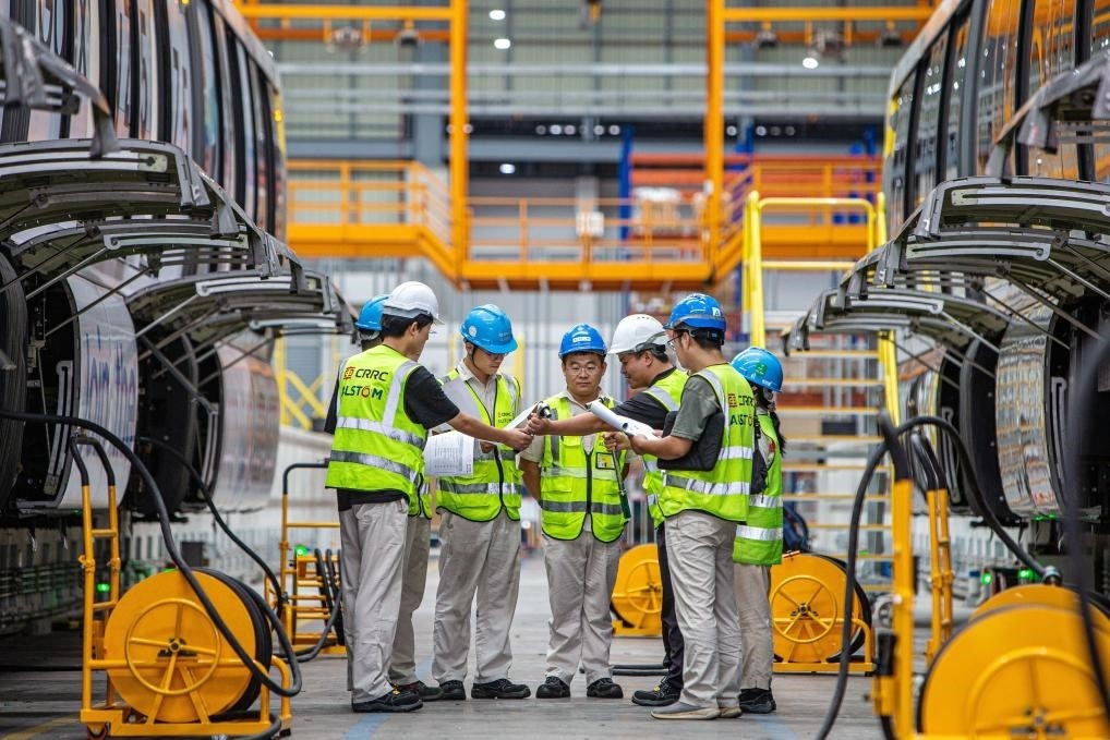 2023年9月22日,在泰國(guó)曼谷“黃線”列車維護(hù)中心,中車浦鎮(zhèn)阿爾斯通運(yùn)輸系統(tǒng)有限公司工作人員檢修列車。新華社記者王騰攝