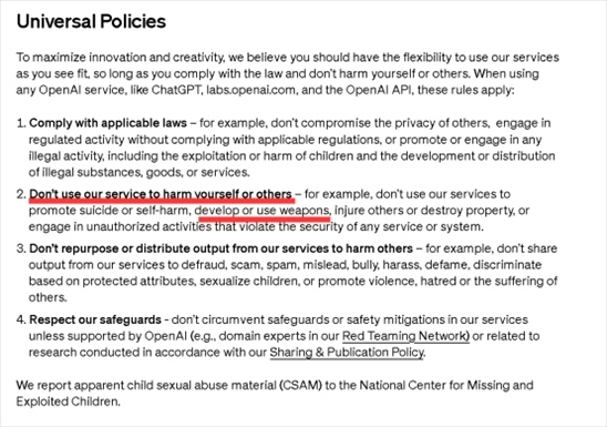 然而,在1月10日對(duì)其使用條款進(jìn)行一番大更新后,OpenAI公司雖然在禁止項(xiàng)中仍然提到禁止將其產(chǎn)品、模型和服務(wù)用于會(huì)導(dǎo)致人員傷亡的用途上,并提到了“武器開發(fā)和使用”,但先前同樣被禁止的軍事用途,如今卻在文本中消失了。