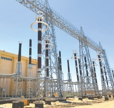 位于蘇伊士省的埃克薩迪亞500千伏變電站項目現(xiàn)場,鐵塔高聳,一條條高壓輸電導線接入變電站設(shè)備,電流通過導線時發(fā)出嗡嗡聲。