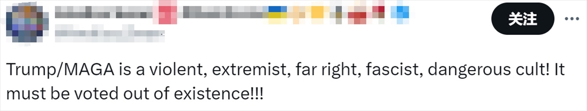 有人喊話:“特朗普/MAGA(即讓美國再次偉大口號)是一個暴力的、極端的、極右翼的、法西斯的、危險的邪教!一定要用投票讓它不復存在!?。 ?/p>