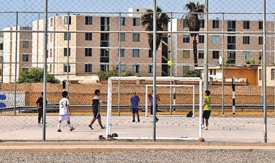 當(dāng)?shù)厍嗌倌暝陧?xiàng)目方修建的足球場內(nèi)踢球。