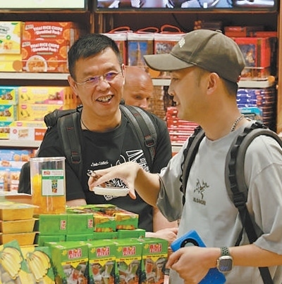 在泰國曼谷素萬那普機場免稅店,兩名中國游客正在購買當?shù)靥厣a(chǎn)品。