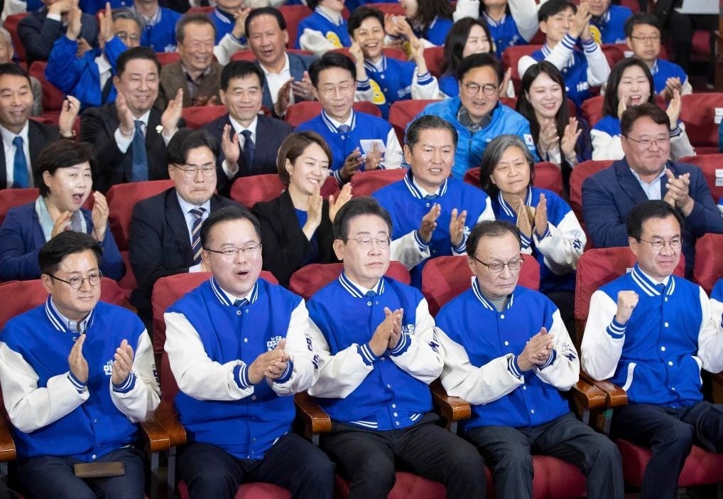 4月10日,在韓國首爾,韓國最大在野黨共同民主黨黨首李在明(前排中)與共同民主黨領導層共同慶祝出口民調(diào)結果大幅領先。新華社記者姚琪琳攝