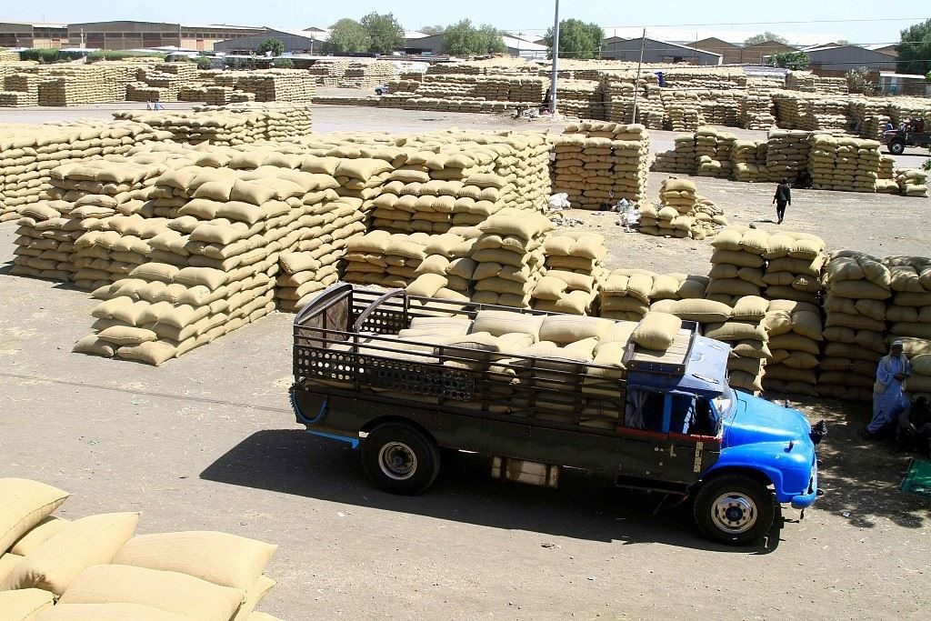 當(dāng)?shù)貢r間2024年2月22日,蘇丹東部杰達(dá)雷夫市,卡車在一個市場里運(yùn)送谷物。聯(lián)合國糧食計(jì)劃署表示,蘇丹長期武裝沖突導(dǎo)致當(dāng)?shù)亟^大多數(shù)人都面臨饑餓。
