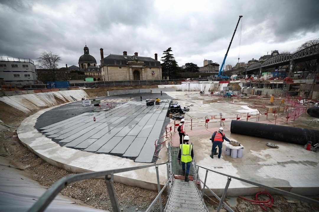 當?shù)貢r間2024年3月13日,法國巴黎,建造中的巨型地下雨水蓄水池施工現(xiàn)場。