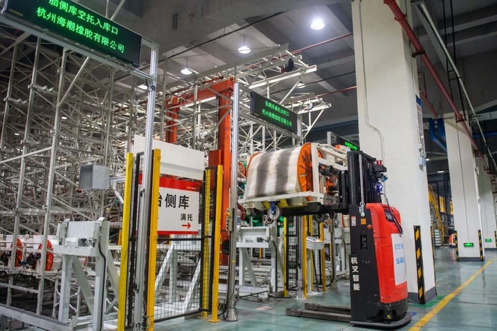?在杭州市錢塘區(qū)中策橡膠集團(tuán)股份有限公司未來(lái)工廠內(nèi),無(wú)人叉車在運(yùn)輸產(chǎn)品(2024年2月23日攝)。新華社記者 江漢 攝