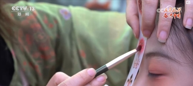 花鈿是古代女性在額頭部位點綴的一種花飾?,F在的胡芯銀,不僅會根據顧客的年齡、臉型和服裝的樣式來搭配不同風格的花鈿,還會給小姐姐們做一些傳統(tǒng)文化的講解。胡芯銀說,要想做得更好,就要多看多學。