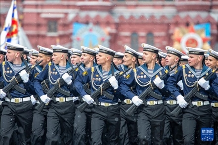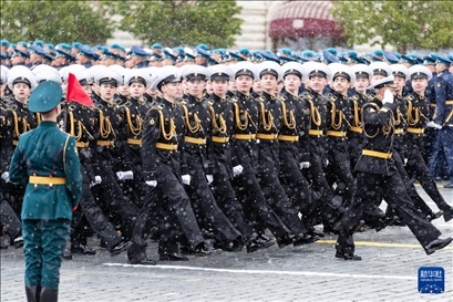 5月9日,在俄羅斯首都莫斯科,士兵列隊(duì)走過紅場(chǎng)。新華社記者 白雪騏 攝