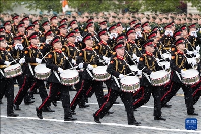 5月9日,在俄羅斯首都莫斯科,鼓手編隊(duì)走過紅場(chǎng)。新華社記者 白雪騏 攝