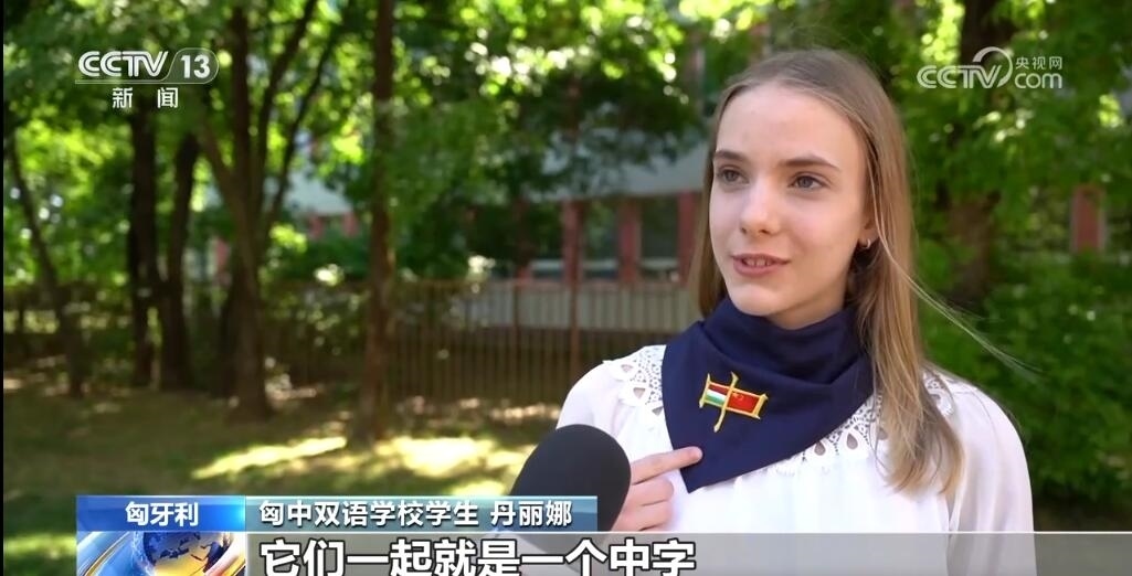 匈中雙語學(xué)校學(xué)生丹麗娜說:“我很開心可以見到他們。我說,您好,我是匈中雙語學(xué)校的丹麗娜,歡迎來到匈牙利。這個(gè)領(lǐng)帶上可以看到匈牙利國(guó)旗和中國(guó)國(guó)旗,它們一起就是一個(gè)中字,這領(lǐng)帶代表兩個(gè)國(guó)家的友誼。我學(xué)了10年漢語,將來這個(gè)語言會(huì)給我打開很多工作的新門?!?/p>