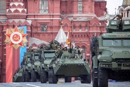 5月9日,在俄羅斯首都莫斯科,軍車編隊(duì)駛過紅場(chǎng)。新華社記者曹陽攝