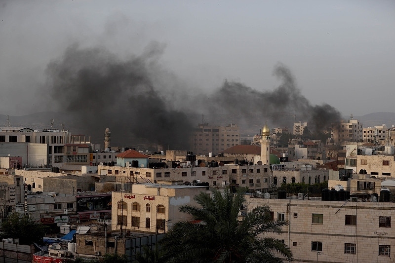 △當(dāng)?shù)貢r間5月22日,約旦河西岸杰寧難民營遭襲后,濃煙滾滾。