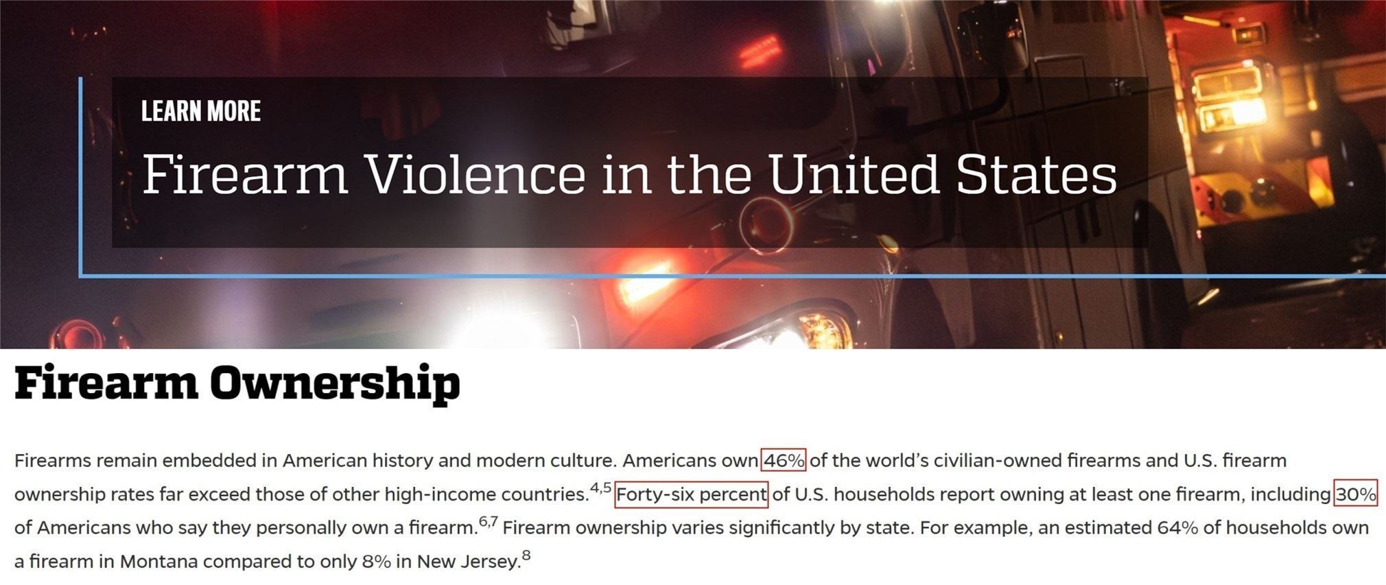 約翰斯·霍普金斯大學(xué)槍支暴力解決方案中心2023年發(fā)布的數(shù)據(jù)顯示,世界上近一半(46%)的民用槍支在美國;近一半(46%)的美國家庭報(bào)告擁有至少一把槍,其中30%的人承認(rèn)自己擁有槍支。