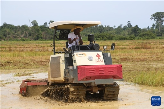 5月31日,在位于科特迪瓦南部迪沃省的格格杜墾區(qū),當(dāng)?shù)胤N植戶(hù)在水稻田里操作農(nóng)機(jī)作業(yè)。新華社記者 張健 攝