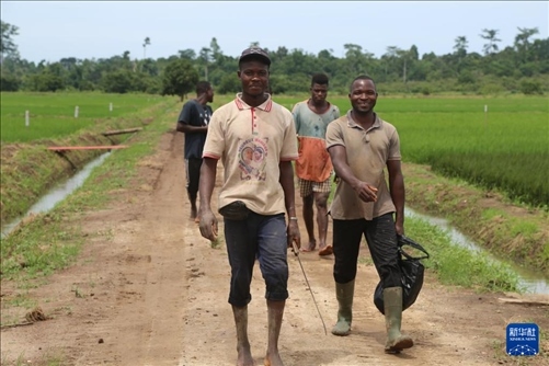 5月31日,在位于科特迪瓦南部迪沃省的格格杜墾區(qū),當(dāng)?shù)胤N植戶(hù)在水稻田邊的道路上行走。新華社記者 張健 攝