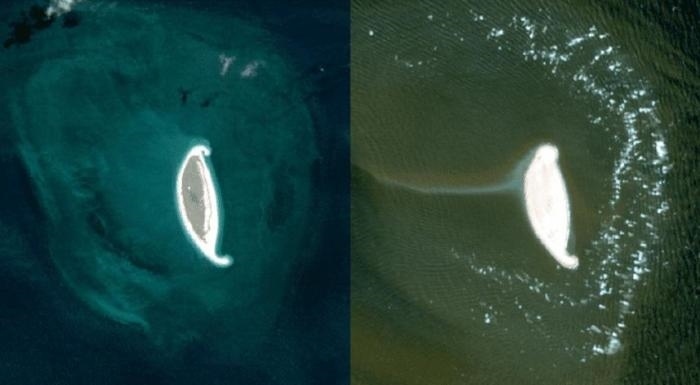 “伊爾薩 ”氣旋一周前(左)和三天后(右)由哨兵-2拍攝的貝德奧島衛(wèi)星圖像(圖片來自歐洲航天局,ESA)。施普林格·自然/供圖
