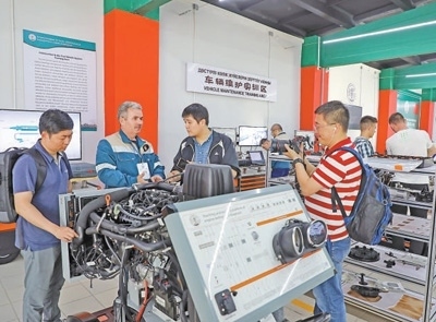 哈薩克斯坦魯班工坊位于東哈薩克斯坦州首府厄斯克門,由天津職業(yè)大學(xué)與東哈薩克斯坦技術(shù)大學(xué)共同承建。圖為在魯班工坊車輛維護實訓(xùn)區(qū),聯(lián)合采訪團隊正在對哈方技術(shù)人員進行采訪。本報記者 趙益普攝