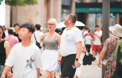兩名外國(guó)游客在上海南京東路步行街游覽。翁奇羽攝(人民視覺)