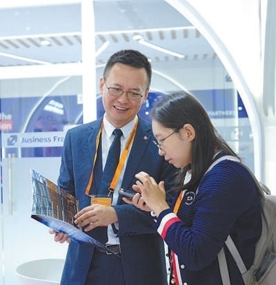 服貿(mào)會(huì)期間,法國(guó)智奧會(huì)展集團(tuán)工作人員與參展觀眾洽談業(yè)務(wù)。歐陽(yáng)功成攝