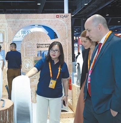 在服貿(mào)會(huì)首鋼園環(huán)境服務(wù)專題展館內(nèi),艾可愛(ài)爾展臺(tái)工作人員為參展觀眾講解空氣凈化整體解決方案。張京飛攝