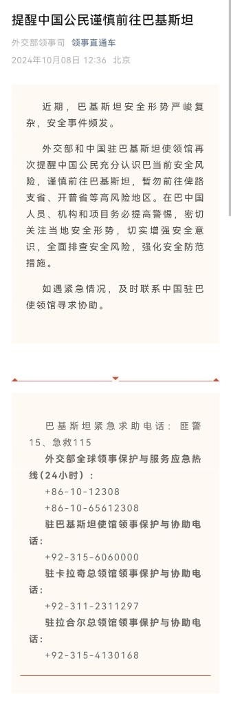 據(jù)外交部“領(lǐng)事直通車”微信公眾號10月8日消息,近期,巴基斯坦安全形勢嚴(yán)峻復(fù)雜,安全事件頻發(fā)。
