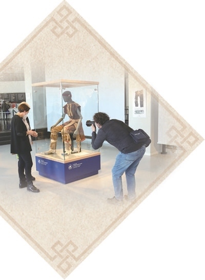 2022年,新疆吐魯番盆地洋海墓地IM21出土服飾復(fù)原品在德國開姆尼茨考古博物館展出。德國開姆尼茨考古博物館供圖