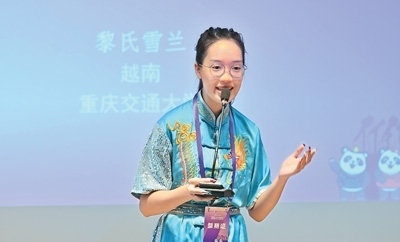 來自越南的黎氏雪蘭來到中國(guó)之后,對(duì)武術(shù)產(chǎn)生了濃厚興趣。圖為她在比賽現(xiàn)場(chǎng)和大家分享自己學(xué)習(xí)武術(shù)的經(jīng)歷。