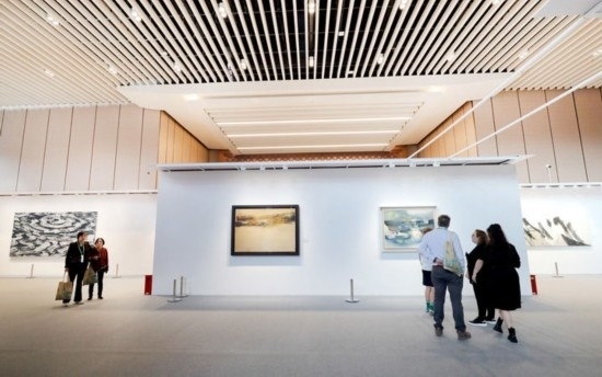 11月9日,觀眾在第七屆進(jìn)博會(huì)國(guó)際現(xiàn)當(dāng)代藝術(shù)專區(qū)觀看繪畫藝術(shù)展品。新華社記者 方喆 攝