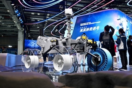這是11月6日在第七屆進(jìn)博會(huì)汽車展區(qū)拍攝的在亞洲首次亮相的米其林月球探測(cè)車輪胎。新華社發(fā)(陳浩明 攝)